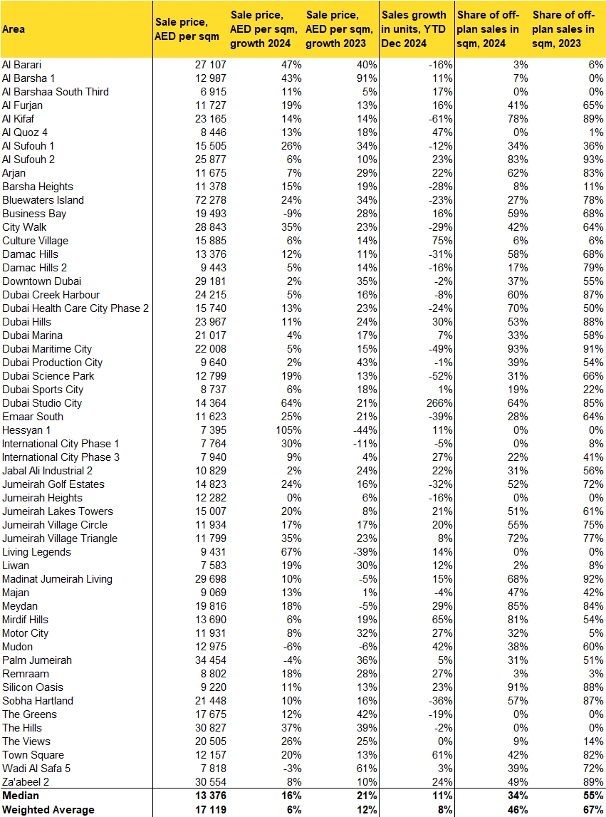 Areas with high shares of off-plan sales, such as Dubai Creek Harbour (85%) and Town Square (61%), underline the growing buyer preference for modern, future-ready properties. These neighborhoods are benefiting from flexible payment plans and the appeal of new developments, making them hotspots for investors and first-time buyers alike.
