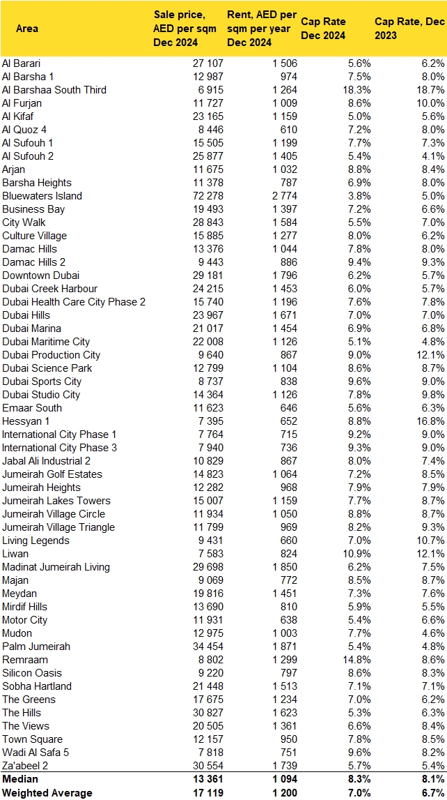 Notably, Remraam has emerged as a key high-yielding area, with its cap rate surging from 8.6% in December 2023 to 14.8% in December 2024, driven by rapid rental growth. Similarly, Wadi Al Safa 5 recorded a strong cap rate of 9.6%, reflecting robust rental performance relative to sales price growth.
