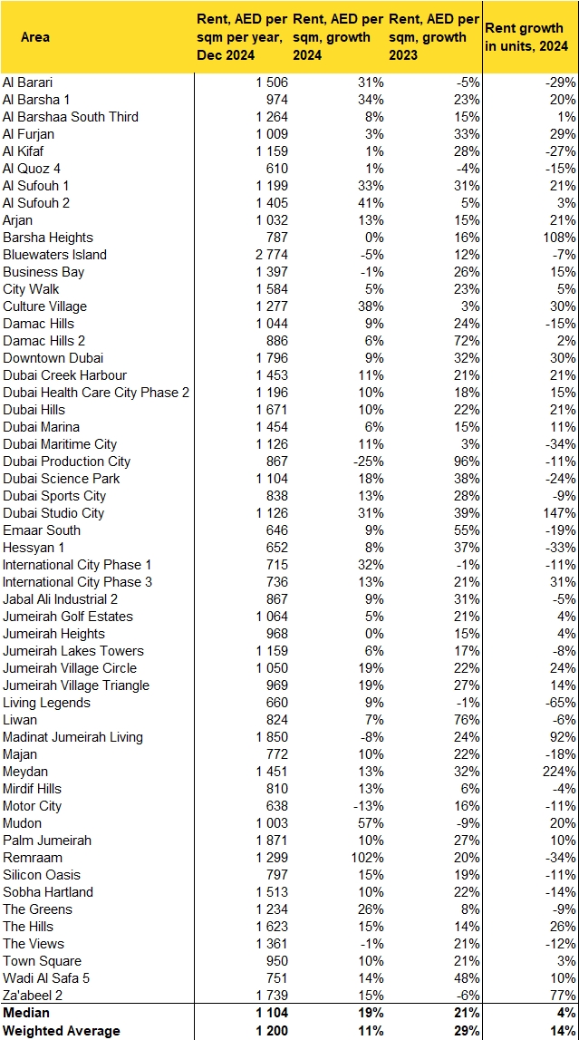 Motor City (-13%), Dubai Production City (-25%), and Madinat Jumeirah Living (-8%) recorded negative rental growth.