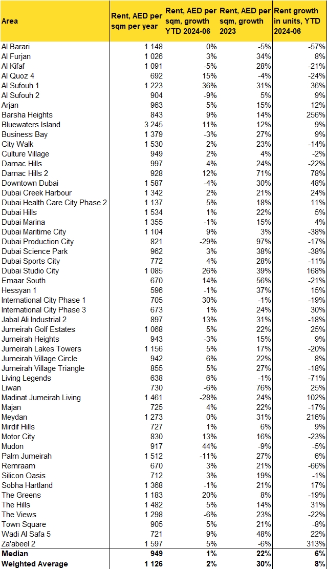 On the flip side, other prominent areas such as Palm Jumeirah and Downtown Dubai have seen rental rates decline by 11% and 4% YTD, respectively. These decreases may be due to an influx of new supply or tenants shifting preferences towards newer or more affordable developments in other parts of the city.