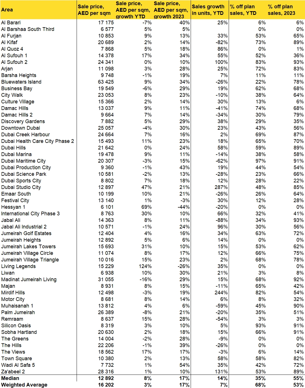 Overall Increase in Off-Plan Sales Share: The weighted average across all areas indicates a significant increase in the share of off-plan sales from 53% in 2023 to 68% in May 2024. This indicates a growing preference among buyers towards investing in properties before their completion, possibly driven by attractive pricing and payment plans offered by developers.